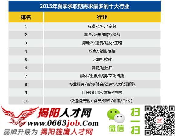 圖為2015年夏季求職需求最多的十大行業(yè),換句話講就是這些行業(yè)的發(fā)展勢頭較猛,屬于朝陽行業(yè),需要更多優(yōu)秀人才。相信大部分人都希望可以進入一個朝陽的行業(yè),在風(fēng)口行業(yè)工作比在夕陽行業(yè)中努力更容易獲得成功。