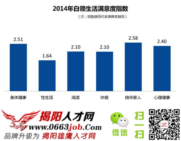 圖為2014年中國白領(lǐng)生活滿意度,中國白領(lǐng)最不滿意的是性生活,滿意度僅為1.64。過半中國白領(lǐng)每月性生活次數(shù)低于1次,其中,46.1%為單身;僅有約1/4的中國白領(lǐng)每周至少過1次性生活。加班、工作壓力較大、出差較多的工作有可能會導(dǎo)致陪伴家人/伴侶的時間大大減少,這也是需要大家考慮的因素之一。