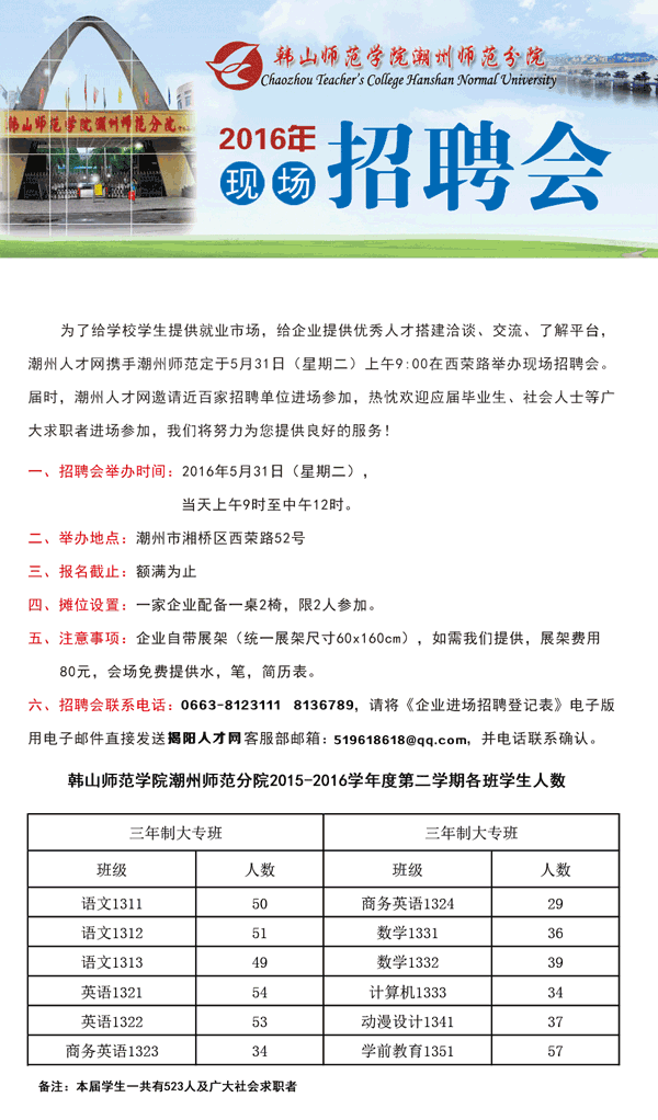 韓山師范學(xué)院潮州師范分院2016年5月31日現(xiàn)場(chǎng)招聘會(huì)